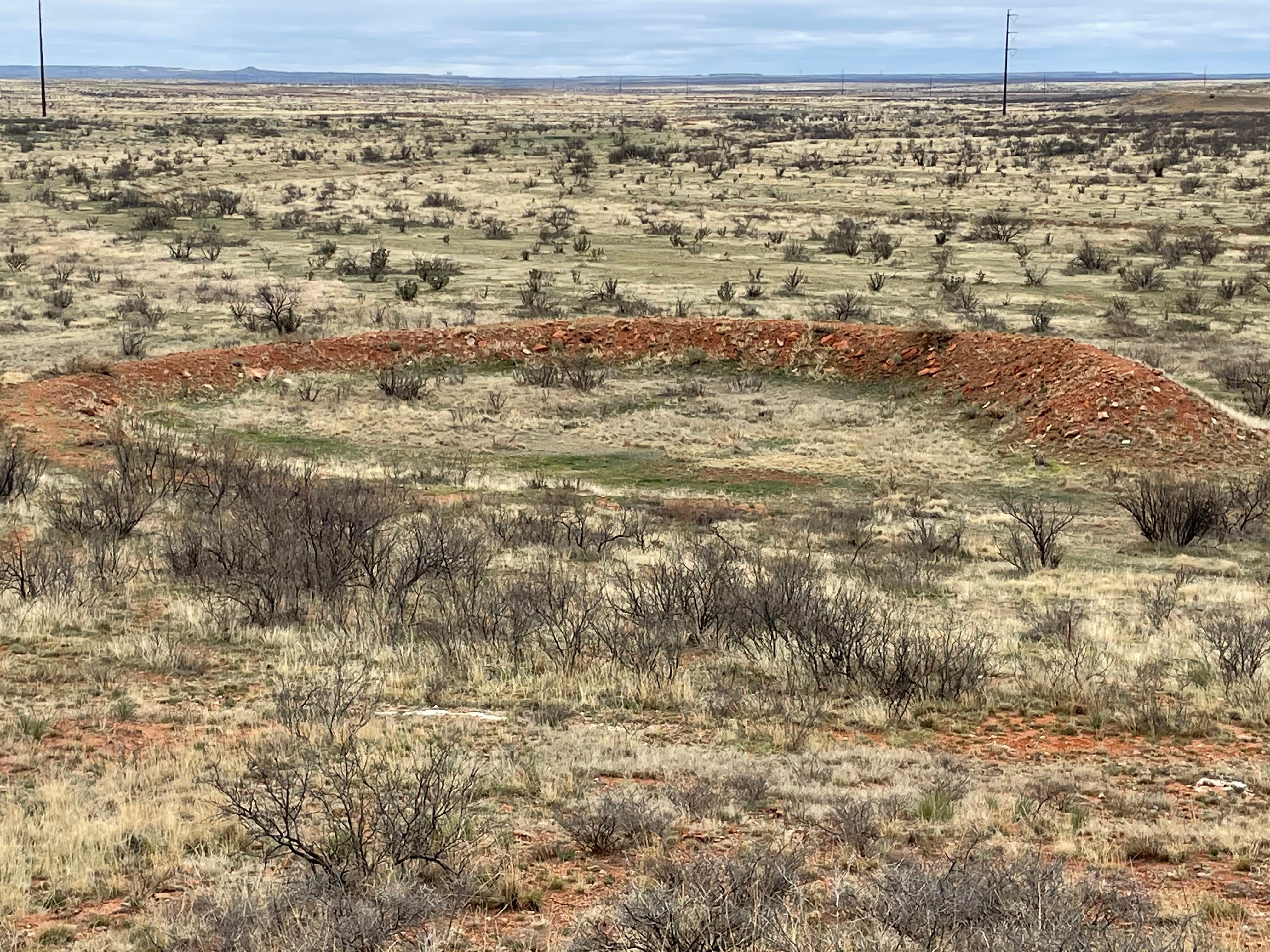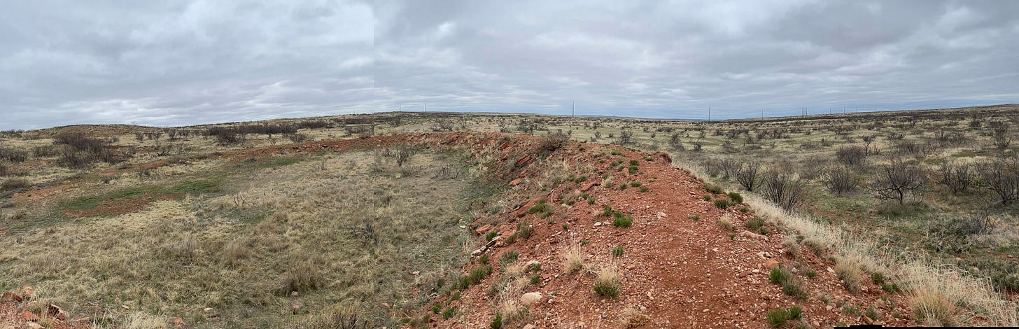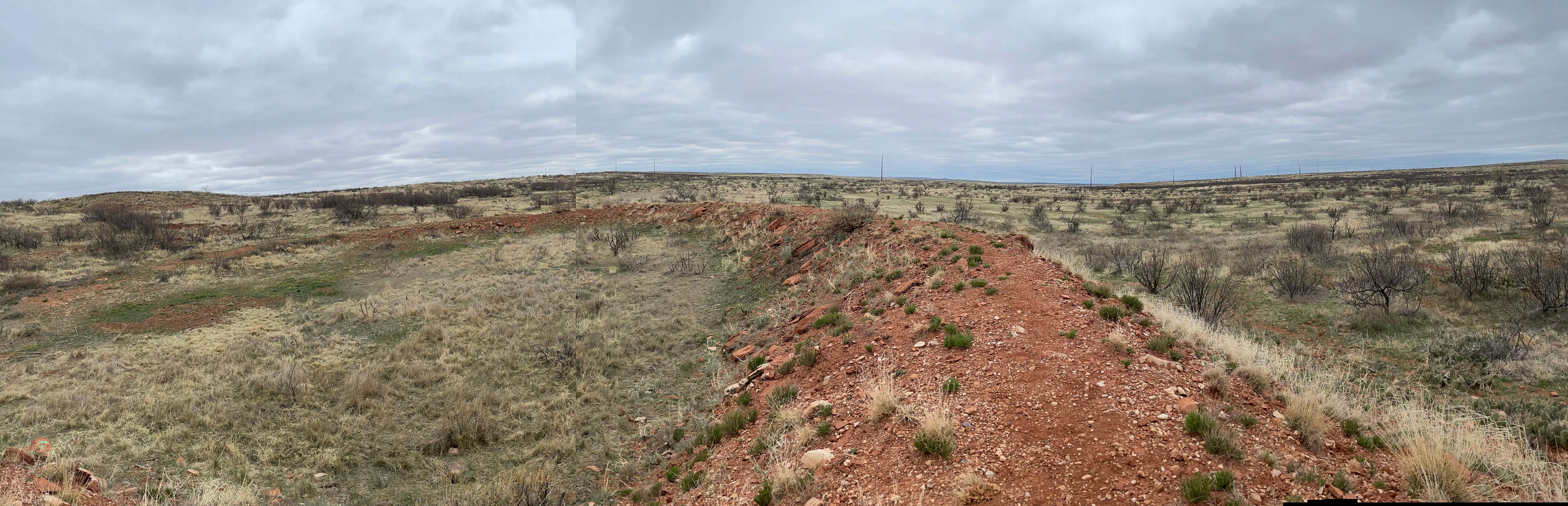 A list: Earth moved. Dump truck. Stakes in the ground. Mesquite with thorns. Frying Pan Cattle manure. Devil’s claw detritus from Proboscidea. Snake holes. Grass. Constant wind. Mesas in the distance. Rusted pipes. Ashen Clouds. Cracked earth. Red Clay. Fences, barbed and hinged. He (helium) underneath. Nuclear bombs in storage in the near distance. From dust to dust, we shall we return.